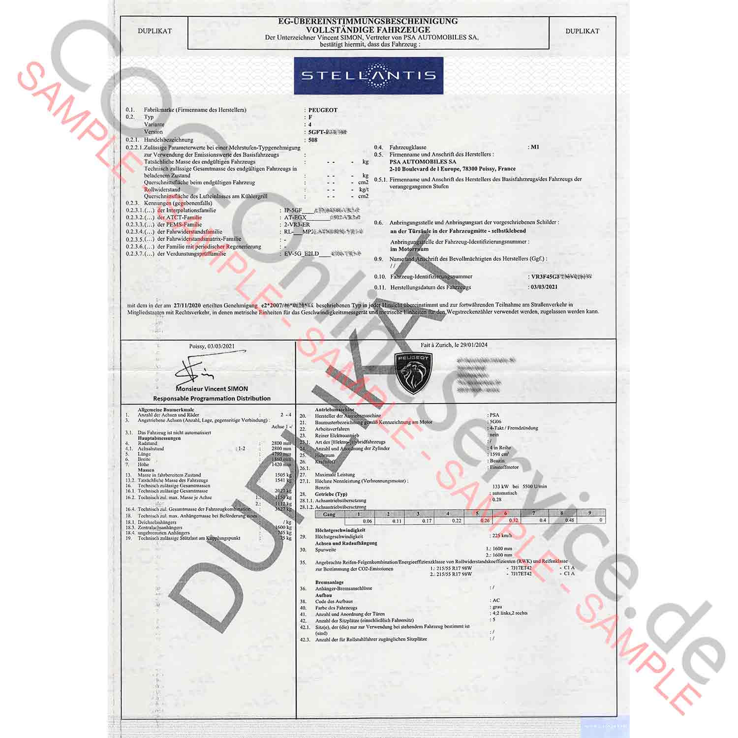 COC dokumenty pro Peugeot (Certificate of Conformity)